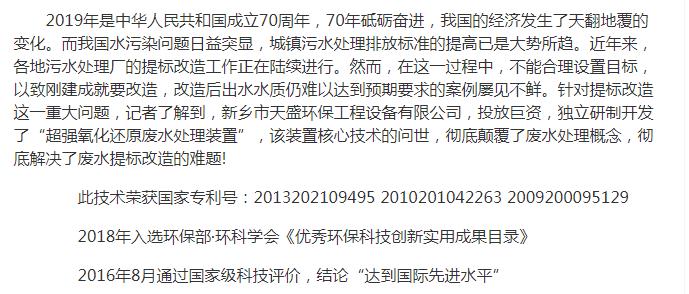 中國高新技術(shù)網(wǎng)發(fā)布:《關(guān)注:解碼科技創(chuàng)新》——新鄉(xiāng)市天盛環(huán)?!俺瑥?qiáng)氧化還原廢水處理技術(shù)”