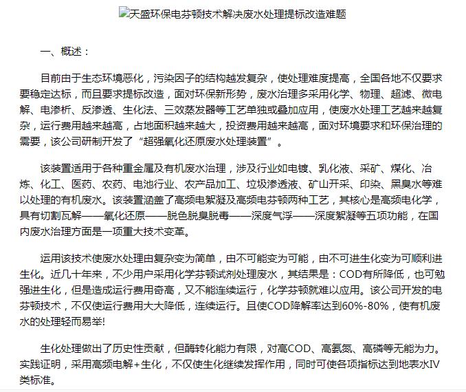 亞洲在線刊登:天盛環(huán)保電芬頓技術(shù)解決廢水處理提標改造難題